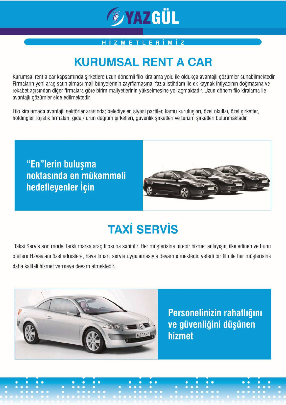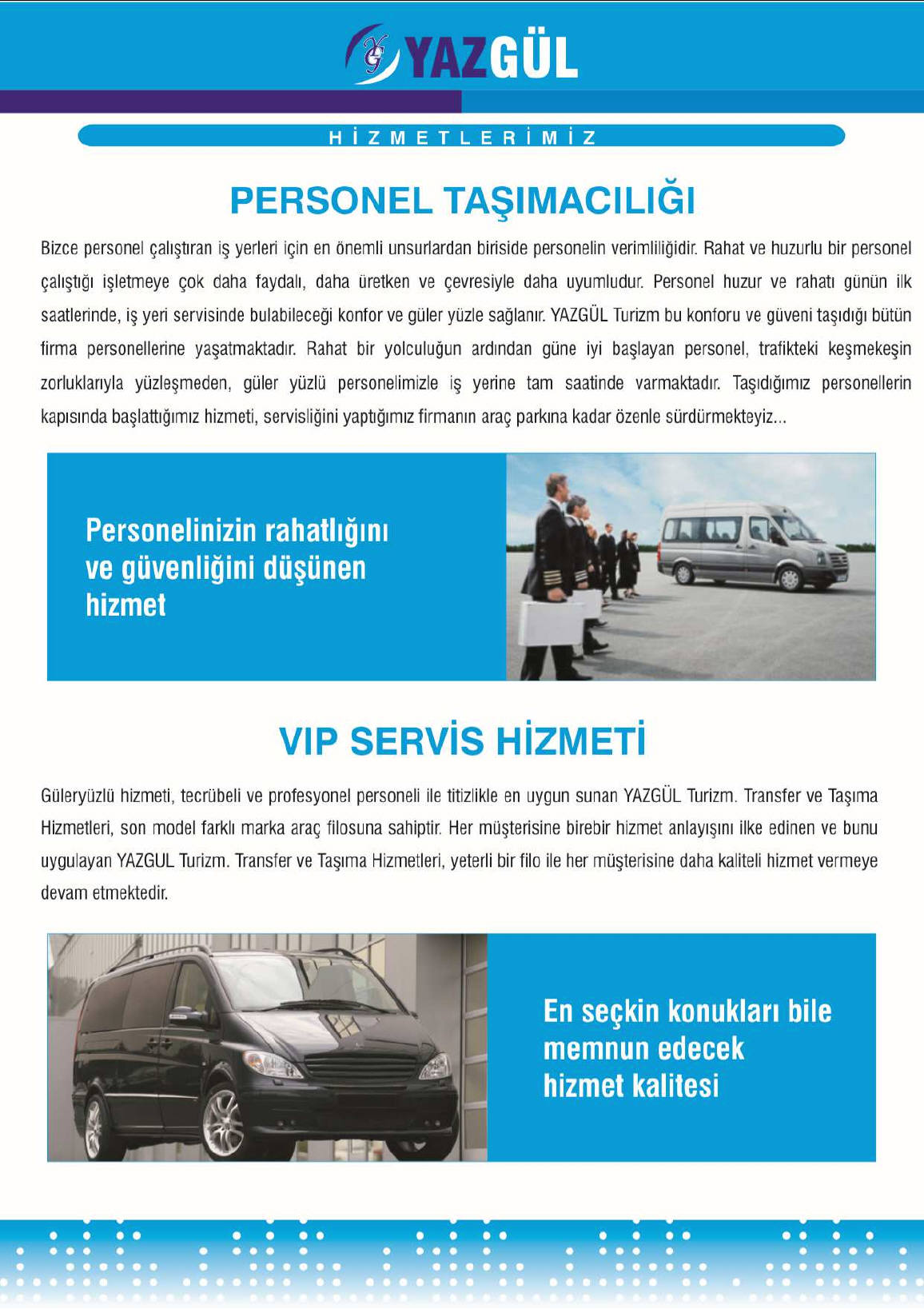 YAZGÜL TURİZİM bünyesinde var olan özel transfer hizmetleri birimimiz; sektöründe isim yapmış yerli ve yabancı sermayeli firmaların üst düzey yöneticilerine, özel konuklarına ve şirket personellerine, modern ve donanımlı araçlarla, deneyimli ve saygılı araç sürücüleri ile özel taşımacılık hizmeti vermektedir.